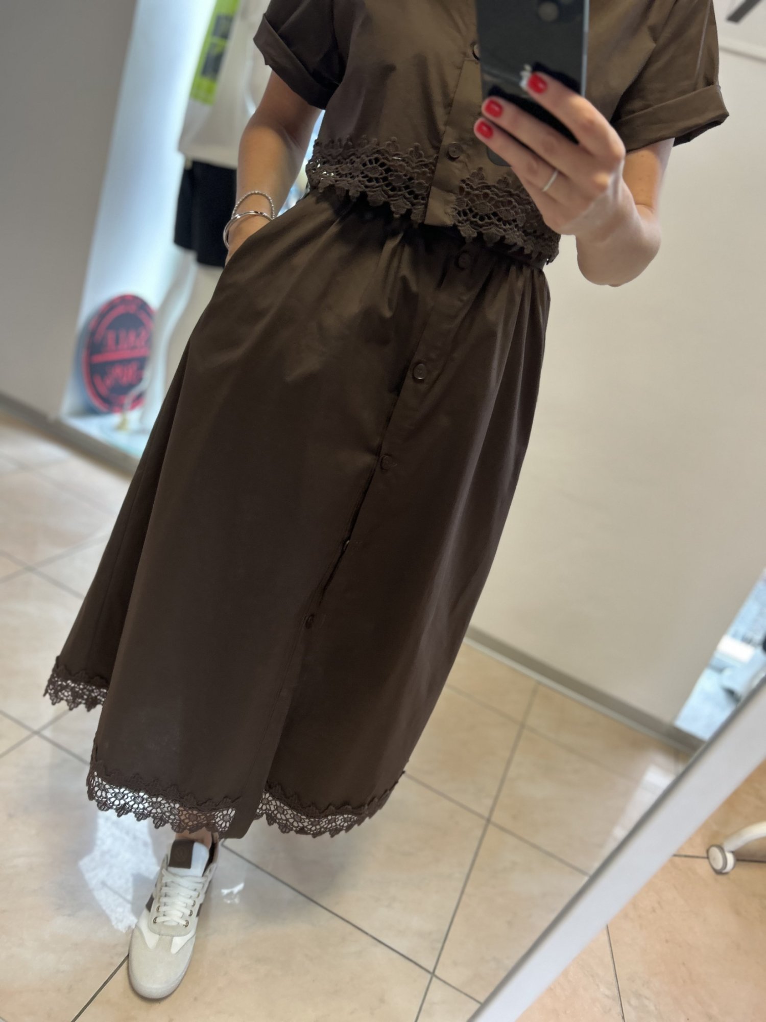 Dámska hnedá sukňa s vyšším pásom.